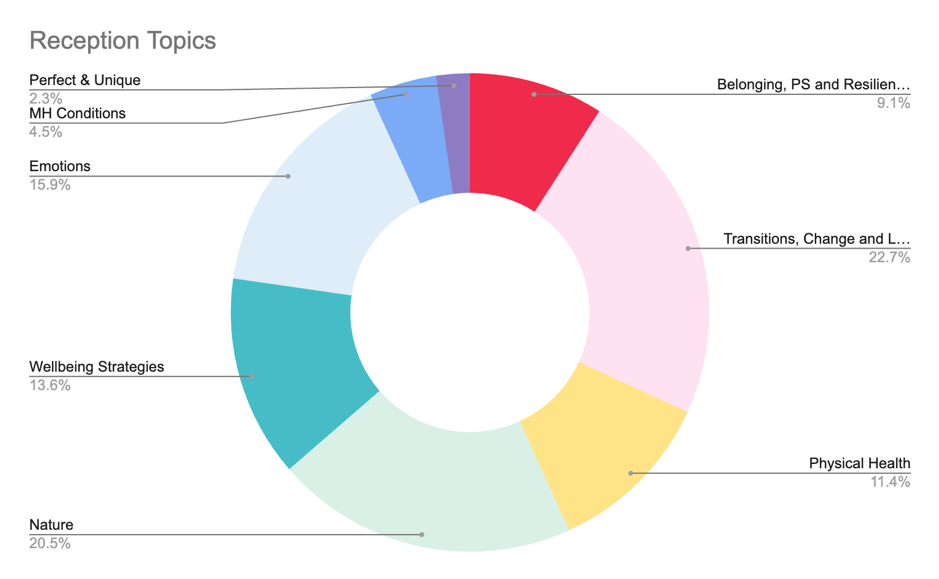 - Themes related to changes, loss, self-care, problem-solving and resilience, health, emotions, anxiety and being creative and unique.